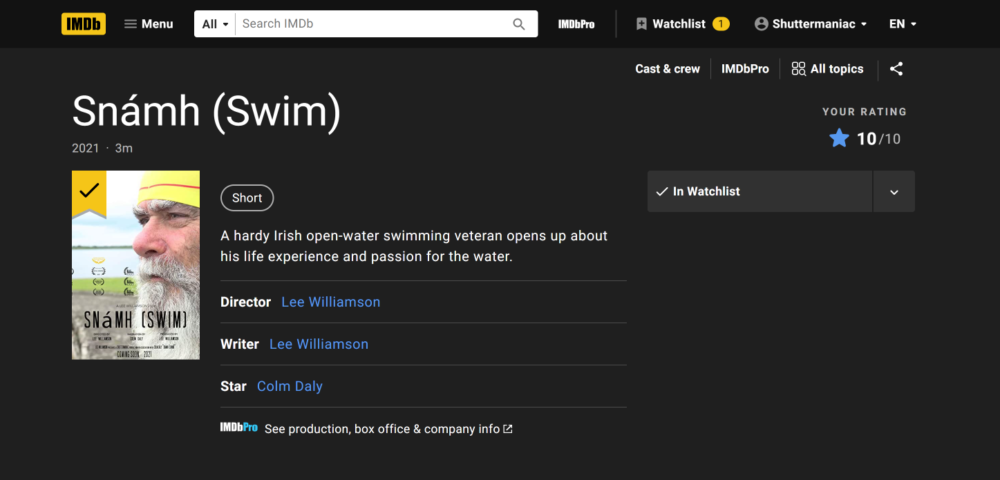 Multi Award-Winning Short Film focussing on mental health, featuring 70yr old Open Water Swimmer Colm Daly.